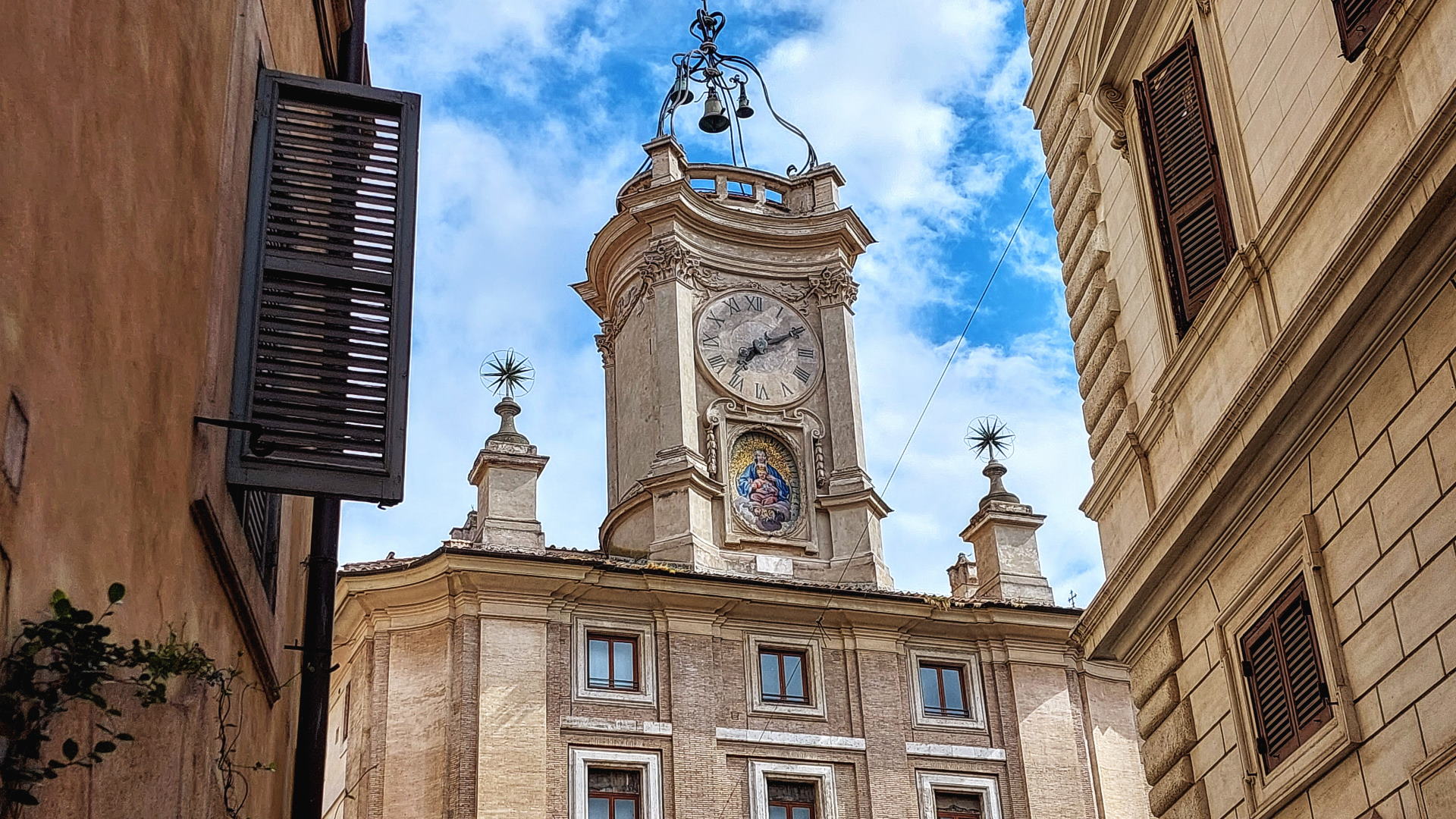 Designed and built under the direction of Borromini between 1647 and 1649, the clock tower decorates a corner of the convent of the Oratorian Fathers, which, together with the oratory and the church of Santa Maria in Vallicella, formed the headquarters complex of the religious order founded by St. Philip Neri in the second half of the 16th century. The tower interrupts the simplicity and austerity of the building below by breaking up its architectural uniformity: in fact, it is characterized by concave and convex surfaces and lines, according to the purely Borrominian style, and is surmounted by a castle with iron volutes supporting the bells and suggesting the idea of a belfry. It is flanked by two pillars with 24-pointed bronze heraldic stars while, under the clock face, a splendid mosaic embellishes the whole: it represents the "Madonna of Vallicella" and was designed by Pietro da Cortona.
