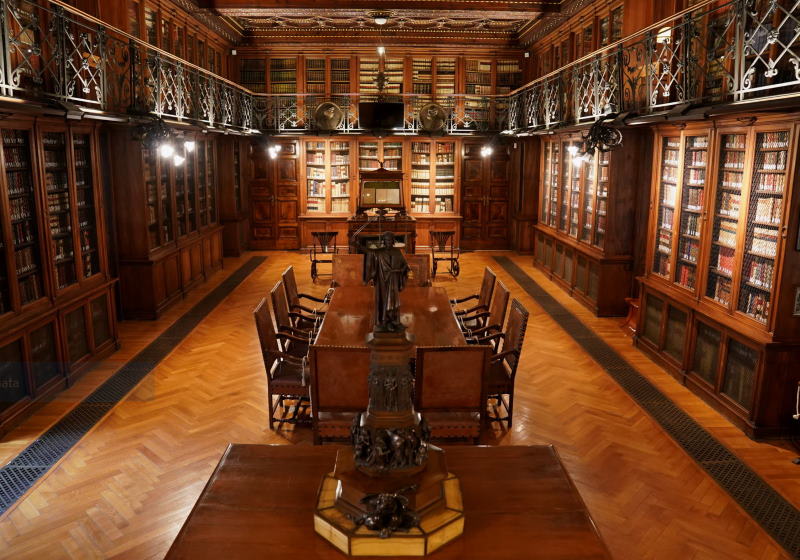 A historic Roman residence overlooking the Sacred Area of Largo di Torre Argentina, of which it forms an elegant architectural backdrop. Enlarged and enriched by its numerous owners over the centuries, then partially demolished in the late 19th century when Corso Vittorio Emanuele II was opened, the building was finally purchased in 1905 by Marco Besso. Here he lived with his family, transforming the building a few years later into the seat of the foundations named after him and his wife Ernesta. A financier, refined bibliophile and writer, Marco Besso was also a passionate scholar of Dante: the magnificent library that constitutes the heart of the house boasts one of the most important and richest collections of Dante’s editions. In an environment made warm and evocative by the wooden furnishings made in 1907, we can find rare 15th- and 16th-century editions and many modern Italian and foreign printed books of the Comedy, as well as critical works, bibliographic repertoires and magazines. If you think it is not enough, just look around you: the image of Dante is everywhere, in the bronze and alabaster reproduction of the monument dedicated to him in Trento, in the gold effigies on the backs of the imposing leather armchairs, in the marble bust of the poet and finally in the copies of the oil cruet and the votive lamp from his tomb in Ravenna.