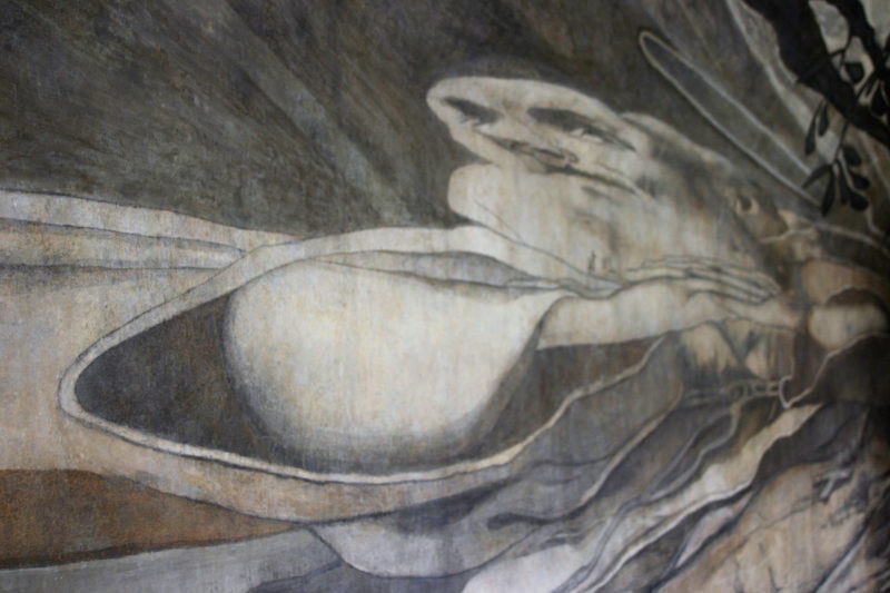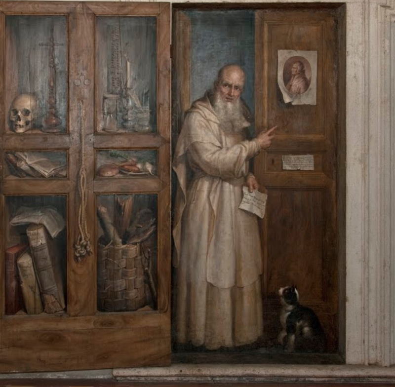 Among the many wonders of the Baths of Diocletian, a lesser-known masterpiece is the wonderful trompe-l’œil painting in the courtyard of Michelangelo’s cloister, and realized in 1855 by Filippo Balbi, a Neapolitan artist. A Carthusian monk comes out from a fake door: his name is Fercoldo and he was a 13th-century well-known French lawyer and judge who chose monastic life after the death of his wife. Painted in full size, he peers at us with a penetrating gaze, pointing his finger at the portrait of his son, Pope Clement IV. Around him are objects of absolute truthfulness and daily utility, a skull and a crucifix, an hourglass, a rosary, a candle, nibs and an inkwell, books and a pair of “pince-nez” glasses. To top it all off, there’s a crouching kitten looking at the monk in a further perspective game of looks.