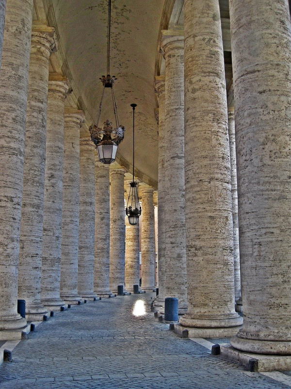 It took eleven years of work (1656-1667), with more than 40 thousand cubic meters of travertine transported from Tivoli by land or pulled by horses along the banks of the river: with its colonnaded arcades, this famous square symbolizes the Church’s universal embrace towards believers but also towards “heretics [...] and agnostics to enlighten them with the true faith”. In designing the colonnade, Gian Lorenzo Bernini played with optical games, with a spectacular result. Crossing the square, the columns will seem to approach and move away, creating movement and a series of full and empty spaces. Looking at the colonnade from the center of the square, at the point indicated by one of the two stone discs on the pavement that mark the focal points of the ellipse, it will instead seem to consist of a single row of columns: the outermost columns will disappear behind those of the internal row.