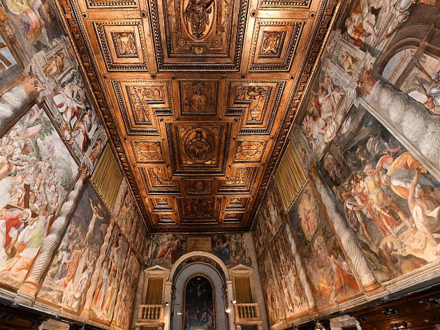 The 16th-century rectangular interior is enriched with frescoes depicting the "Stories of the Passion of Christ", painted between 1569 and 1576 by artists such as Federico Zuccari, Cesare Nebbia and Livio Agresti.