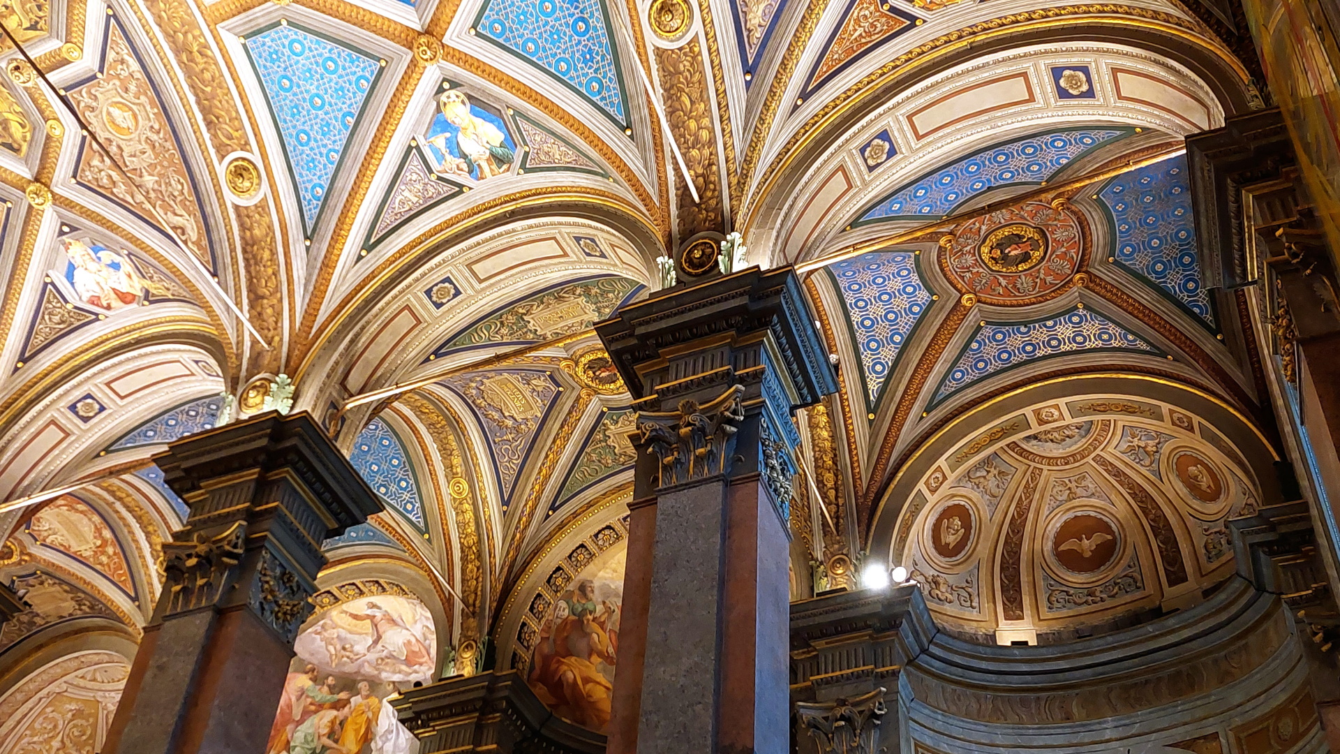 L'équilibre sobre de l'extérieur est contrebalancé par la richesse et la solennité de l'intérieur, divisé en trois nefs par d'énormes piliers posés sur des bases très hautes. Les nefs latérales sont flanquées de chapelles s'élevant jusqu'à la voûte, suivant le modèle des "Hallenkirchen", ou églises-halles, le style typique des églises germaniques du gothique tardif. Les huit chapelles contiennent une multitude de chefs-d'œuvre : entre autres, les fresques de Francesco Salviati pour la chapelle des margraves de Brandebourg, commandées par le cardinal Johann Albrecht de Brandebourg, archevêque de Magdebourg et grand adversaire de Luther ; les "Miracles de Saint Bennone" de Carlo Saraceni, peintre célébré dans la première moitié du XVIIe siècle comme le premier grand héritier de Caravaggio ; une "Pietà" de Lorenzetto terminée par Nanni di Baccio Bigio ; les "Histoires de la Vierge" peintes à fresque par Girolamo Siciolante da Sermoneta.