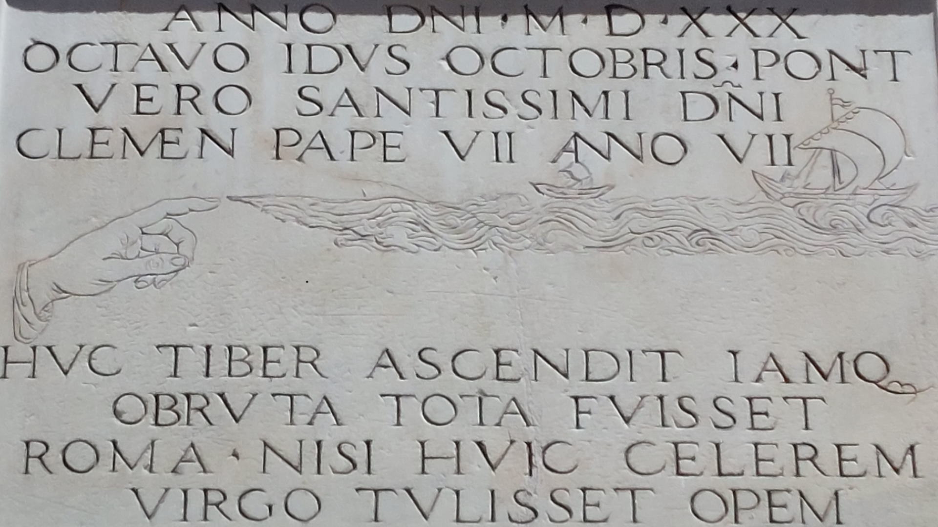 La prima lapide che ancora riporta correttamente il livello raggiunto dalle acque di piena si riferisce all’inondazione del novembre 1422 e si trova sulla facciata di Santa Maria sopra Minerva. È in buona compagnia perché la chiesa, situata in una delle zone più basse della città, dove l’acqua raggiungeva altezze considerevoli, conserva la memoria anche delle piene degli anni 1495, 1530, 1598 e 1870. Tra il Quattrocento e il Settecento, la più devastante fu probabilmente l’esondazione del Natale del 1598, quando le acque del fiume in piena arrivarono fino al livello di 19,56 metri a Ripetta, un record rimasto insuperato, sommergendo per ben sei metri le colonne del Pantheon e provocando migliaia di morti. Nove molini furono distrutti dalla corrente del Tevere, che trascinò via persino i cadaveri nelle tombe di Santa Maria dell’Anima e inghiottì tre delle sei arcate dell’antico pons Aemilius, conosciuto all’epoca con il nome di Ponte Senatorio e da quel giorno ribattezzato Ponte Rotto. Tali furono i danni che ben 12 lapidi furono affisse in città, per esempio all’ingresso di piazza del Popolo, a via Santa Maria de’ Calderari e sul lungotevere in Sassia. Un’ulteriore, originale, testimonianza della catastrofica piena è la Fontana della Barcaccia: a ispirare i Bernini, si dice, fu il ricordo di un relitto di un barcone trascinato in quell’occasione dal fiume in piena fino a piazza di Spagna.