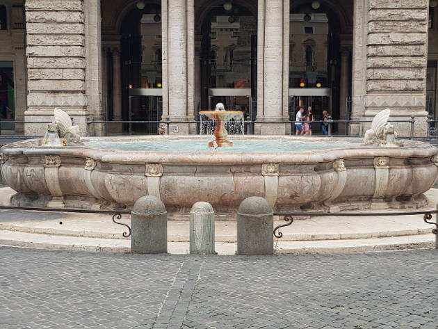 Presenta una vasca ottagona con i lati alternativamente concavi e convessi, in marmo portasanta, ornata da fasce verticali con sedici teste di leone in marmo bianco. Nel 1585 vi fu immessa l’Acqua Vergine.