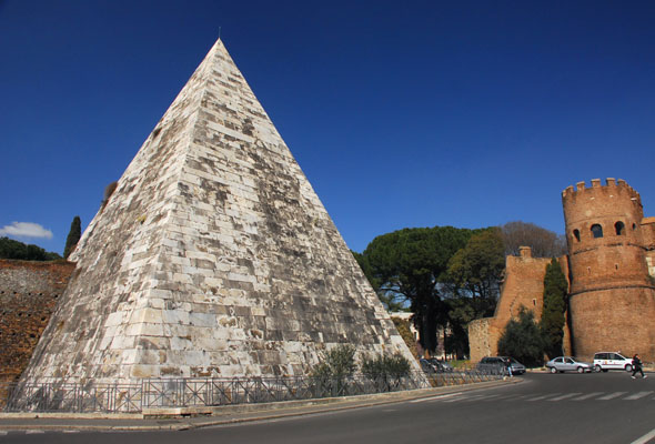 Uno dei personaggi che come sepolcro scelse una piramide fu Caio Cestio, pretore, tribuno della plebe e membro del Collegio dei Septemviri Epulones, magistrati che avevano il compito di organizzare i banchetti sacri in onore delle più importanti divinità, come si evince da una delle iscrizioni sulla facciata. La facciata presenta un’altra iscrizione che ci dice che i lavori di costruzione dovevano durare al massimo 330 giorni, pena la perdita dell’eredità da parte dei familiari. La tomba fu costruita lungo la via Ostiense, tra il 18 e il 12 a.C.. Quattro secoli più tardi, su iniziativa dell’imperatore Aureliano, fu inglobata nella nuova cinta muraria.