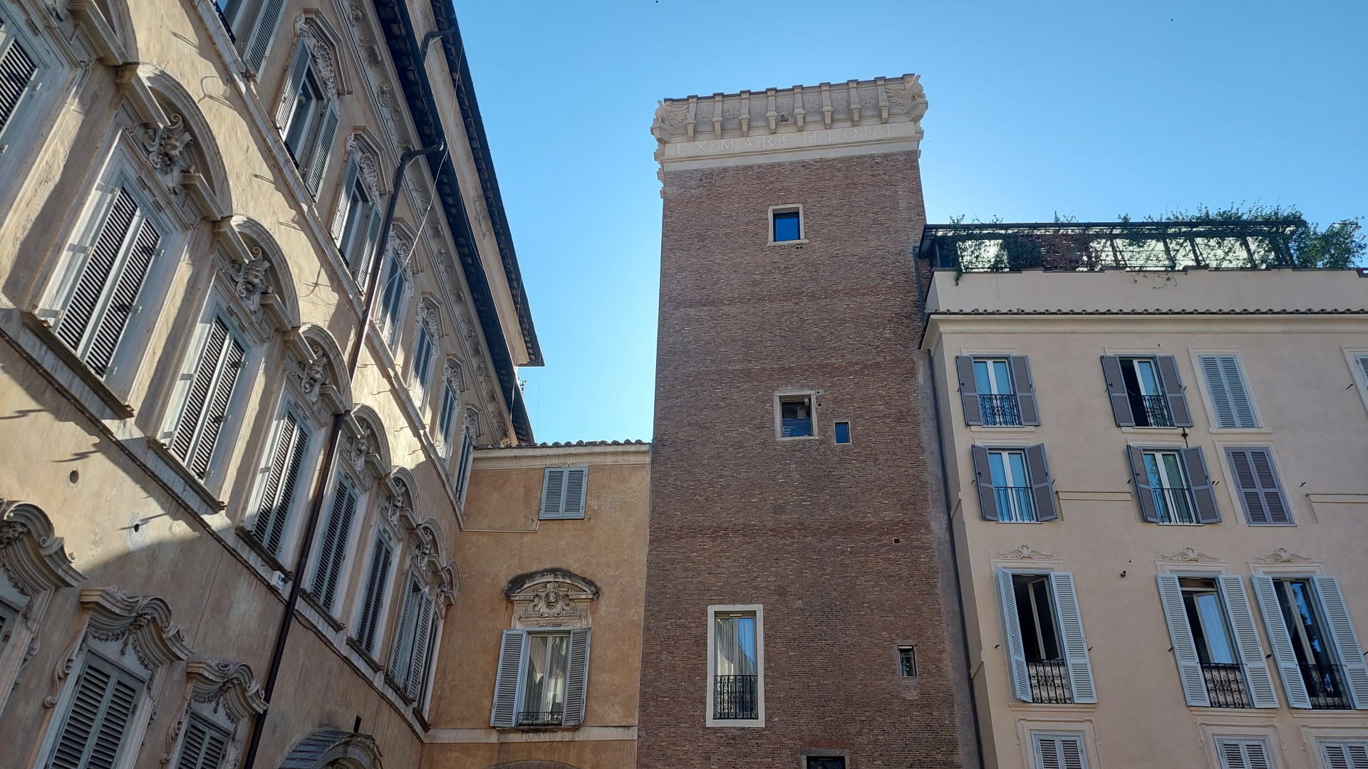Tra i ripidi saliscendi del Rione Monti, una pittoresca dimora seicentesca ingloba una altrettanto pittoresca torre medievale, una delle tante che, insieme alle decine di campanili innalzati accanto alle chiese, caratterizzarono nei cosiddetti secoli bui il profilo della città, dandole un deciso slancio verticale.