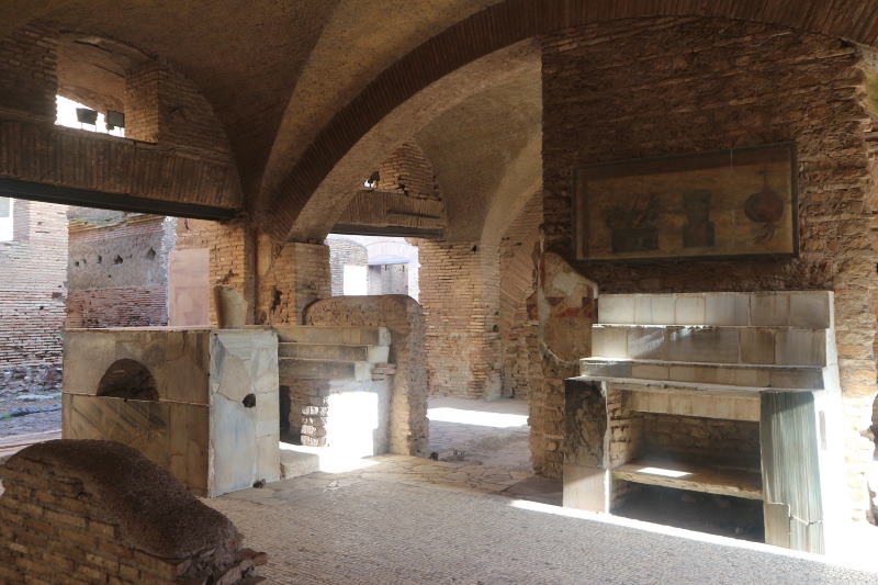 All’ora di pranzo non può mancare una sosta in un thermopolio: sarebbe la locanda di età romana, con tanto di bancone in marmo e di pietanze in menù affrescate alle pareti. Il Thermopolio di via della Casa di Diana, molto vicino al Foro e quindi in posizione centralissima, è il più noto e il meglio conservato. Se poi volete semplicemente del pane fresco, il grande panificio di via dei molini, chiamato Molino del Silvano, in età romana avrebbe potuto soddisfare il vostro desiderio: un grande impianto, nel quale si trovano ancora le macine in pietra lavica che riducevano il grano in farina e le impastatrici, nonché un grande forno per la cottura di grandi quantitativi di pane.